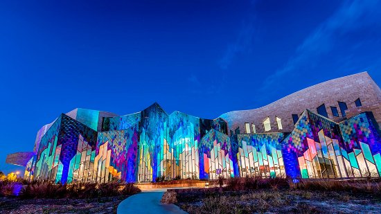 The beautiful museum’s main exterior feature is a wall of colorful dichroic glass – the first application on any building in North America! Which is meant to reflect the imagery of the “tallgrass prairie”. The glass is color-shifting, depending on what view you have, creating the effect of a prairie fire. The museum is made up of a few different sections, some of which are designed to be hands-on and geared toward children such as the Discovery Room, and there is also a Great Hall where you can learn about how science and technology are used. There is also a giant T-rex skeleton!